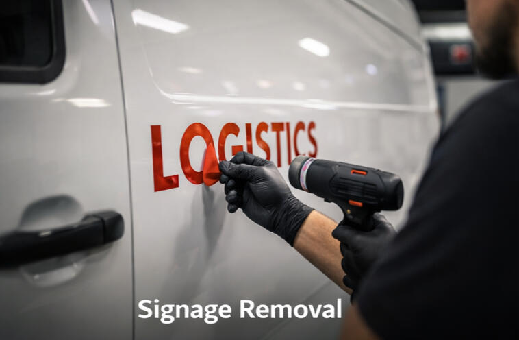 Signage RemovalStarting from $150, our professional signage removal service safely removes old decals, vinyl graphics, and business signage from your vehicle. We use specialized tools and adhesive removal techniques to lift the vinyl without damaging your paintwork.Once the signage is removed, we clean the area thoroughly to remove any leftover adhesive and help reduce visible “ghosting” from previous graphics. This service is ideal for decommissioned work vehicles, rebranding, or preparing a vehicle for sale, leaving your paint looking clean and uniform again.